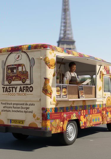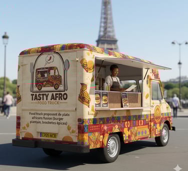 Description : Food truck proposant des plats africains fusion (burger plantain, brochettes épicées).